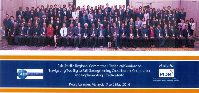 IADI亞太區域委員會(Asia-Pacific Regional Committee, APRC)與馬來西亞存款保險公司(Malaysia Deposit Insurance Corporation, MDIC)於103年5月上旬於馬來西亞吉隆坡共同舉辦國際研討會,本公司由副總經理陳聯一及清理處稽核王亮之與會,本次會議計有來自21國139名代表參加。